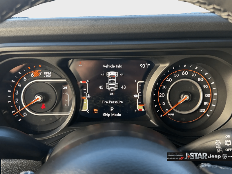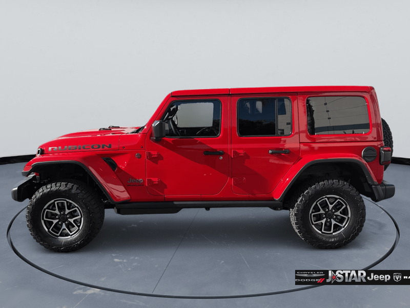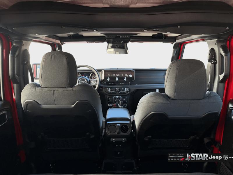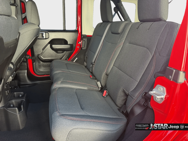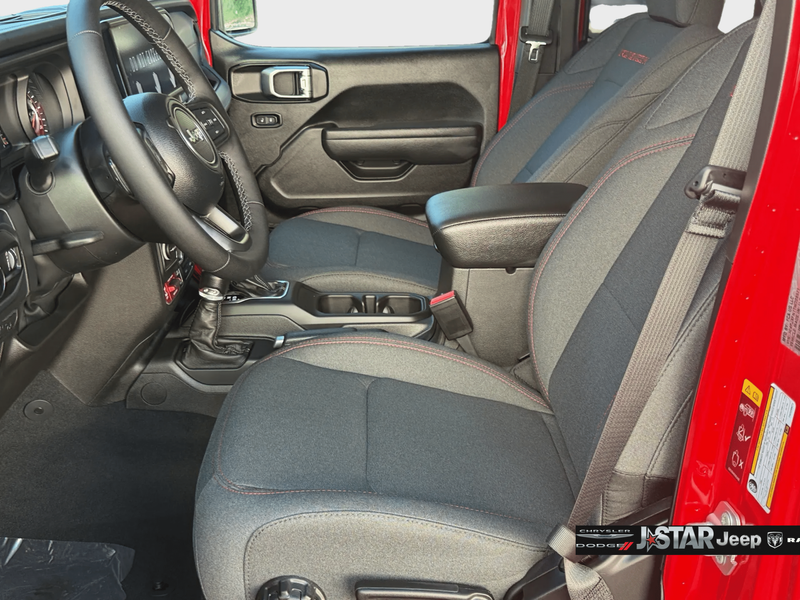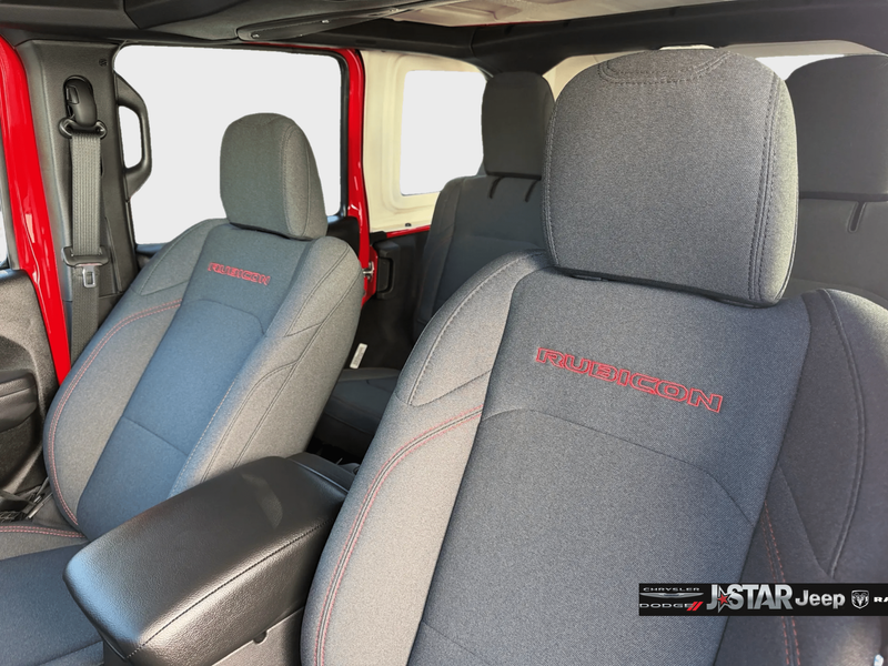 Convenience Group (Heated Front Seats, Heated Steering Wheel, and Universal Garage Door Opener), Quick Order Package 22R Rubicon, Quick Order Package 23R Rubicon, 12.3'' Touchscreen Display, 4-Wheel Disc Brakes, 4.10 Rear Axle Ratio, 4G LTE Wi-Fi Hot Spot, 8 Speakers, ABS brakes, Air Conditioning, Alloy wheels, AM/FM radio: SiriusXM with 360L, Apple CarPlay, Apple CarPlay/Android Auto, Automatic temperature control, Aux Battery, Auxiliary Switches, Body Color 3-Piece Hard Top, Body Color Rubicon Highline Flare, Brake assist, Class II Receiver Hitch, Cloth Low-Back Bucket Seats, Compass, Connectivity - US/Canada, Delay-off headlights, Driver door bin, Driver vanity mirror, Dual front impact airbags, Dual front side impact airbags, Electronic Stability Control, Emergency communication system: Jeep Connect, For More Info, Call 800-643-2112, Freedom Panel Storage Bag, Front anti-roll bar, Front Bucket Seats, Front Center Armrest w/Storage, Front dual zone A/C, Front fog lights, Front License Plate Bracket, Front reading lights, Fully automatic headlights, Google Android Auto, Heated door mirrors, Illuminated entry, Integrated Center Stack Radio, Integrated roll-over protection, Jeep Trail Rated Kit, Low tire pressure warning, MOPAR All-Weather Floor Mats, Non-Lock Fuel Cap Without Discriminator, Occupant sensing airbag, Outside temperature display, Overhead airbag, Panic alarm, ParkView Rear Back-Up Camera, Passenger door bin, Passenger vanity mirror, Performance Suspension, Power door mirrors, Power steering, Power windows, Radio data system, Radio: Uconnect 5 with 12.3'' Display, Rear anti-roll bar, Rear reading lights, Rear Window Defroster, Rear Window Wiper/Washer, Remote keyless entry, Security system, SiriusXM Radio Service, SiriusXM with 360L, Speed control, Split folding rear seat, Steering wheel mounted audio controls, Stop-Start Dual Battery System, Tachometer, Telescoping steering wheel, Tilt steering wheel, Traction control, Trip computer, Variably intermittent wipers, Voltmeter, and Wheels: 17'' x 7.5'' Machined/Painted Black.