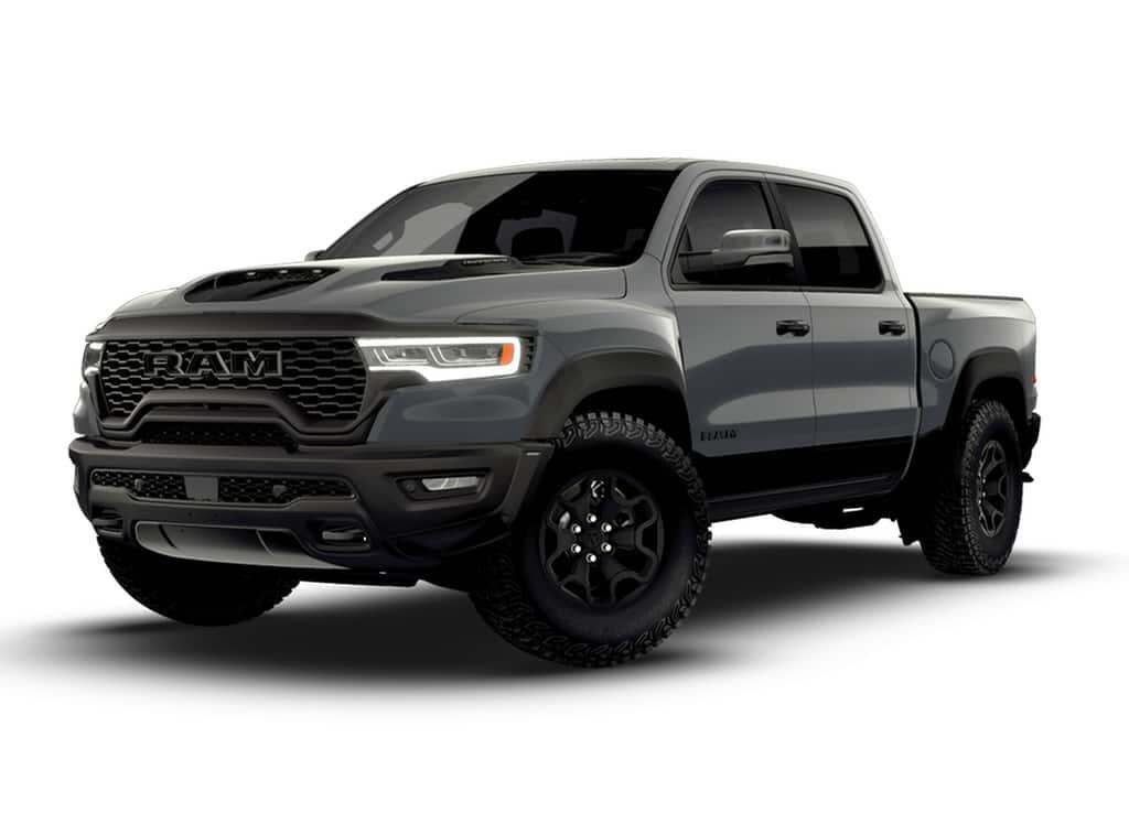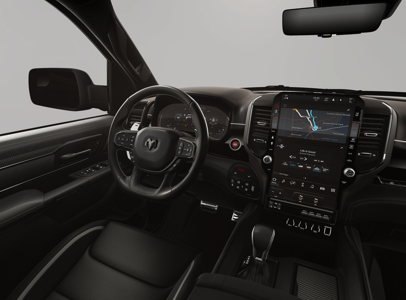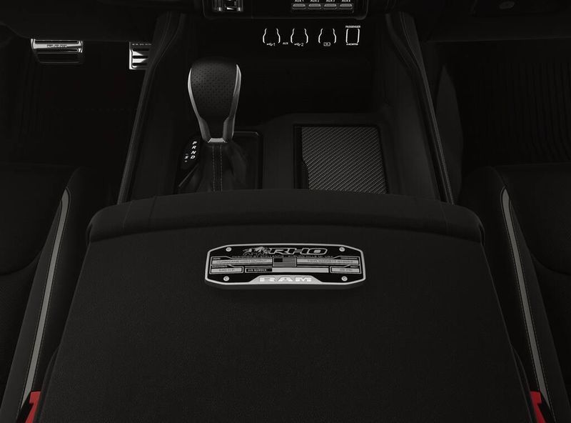 Bed Utility Group (Exterior 115V AC Outlet, MOPAR 4 Adjustable Cargo Tie-Down Hooks, and MOPAR Deployable Bed Step), Quick Order Package 22Y RHO, RHO Level 1 Equipment Group (12-Way/1-Way Trailer Connector, 14.4'' Touchscreen Display, 240 Amp Alternator, 4G LTE Wi-Fi Hot Spot, Connected Travel and Traffic Services, Connectivity - US/Canada, Disassociated Touchscreen Display, Driver Power Seat Back Massage, Driver Seat Memory, Driver/Passenger Wrapped Assist Handles, Drowsy Driver Detection, Dual Wireless Charging Pad, Evasive Steer Assist, Exterior Mirrors with Memory, Front Passenger Interactive Display, Front Passenger Power Seat Back Massage, Full Length Premium Upgraded Floor Console, GPS Navigation, Hands-Free Active Driving Assist System, Harman/Kardon 19 Speaker Premium Sound, HD Radio, Heads-Up Display, Heated Second Row Seats, Integrated Center Stack Radio, Integrated Voice Command with Bluetooth, Intersection Collision Assist System, Leather/Carbon Flat-Bottom Steering Wheel, LED CHMSL Lamp, Luxury Front Door Trim Panel, Power Adjustable Pedals with Memory, Power Tailgate, Premium Wrapped Instrument Panel Bezel, Radio: Uconnect 5 Nav with 14.4'' Display, Radio/Driver Seat/Mirrors/Pedals Memory, Rain Sensitive Windshield Wipers, Real Carbon Fiber Interior Accents, Rear 60/40 Folding Split Recline Seat, SiriusXM Radio Service, Smartphone as a Key Capable, Surround View Camera System, Traffic Sign Recognition, USB Host Flip, Ventilated Front Seats, and Ventilated Rear Seats), 10 Speakers, 3.92 Rear Axle Ratio, 4-Wheel Disc Brakes, ABS brakes, Adaptive suspension, Adjustable pedals, Air Conditioning, Alloy wheels, AM/FM radio, Apple CarPlay/Android Auto, Auto High-beam Headlights, Auto Power-Folding Mirrors, Auto-dimming door mirrors, Auto-Dimming Exterior Driver Mirror, Auto-dimming Rear-View mirror, Automatic temperature control, Brake assist, Compass, Delay-off headlights, Dome Dual LED Reading Lamp, Driver door bin, Driver vanity mirror, Dual front impact airbags, Dual front side impact airbags, Dual-Pane Panoramic Sunroof, Electronic Stability Control, Exterior Mirrors Courtesy Lamps, Exterior Mirrors with Heating Element, Exterior Mirrors with Supplemental Signals, Exterior Parking Camera Rear, Flareside Box, Front anti-roll bar, Front Bucket Seats, Front Center Armrest w/Storage, Front dual zone A/C, Front fog lights, Front License Plate Bracket, Front reading lights, Front wheel independent suspension, Fully automatic headlights, Garage door transmitter, Heated door mirrors, Heated front seats, Heated steering wheel, Illuminated entry, Leather Shift Knob, Leather steering wheel, Leather Trimmed Bucket Seats, Low tire pressure warning, Manufacturer's Statement of Origin, Navigation System, Occupant sensing airbag, Outside temperature display, Overhead airbag, Overhead console, Panic alarm, Passenger door bin, Passenger vanity mirror, Power door mirrors, Power driver seat, Power passenger seat, Power steering, Power windows, Radio data system, Radio: Uconnect 5 Navigation with 12.0'' Display, Rear reading lights, Rear seat center armrest, Rear step bumper, Rear window defroster, Remote keyless entry, Security system, Speed control, Split folding rear seat, Sport steering wheel, Steering wheel mounted audio controls, Tachometer, Telescoping steering wheel, Tilt steering wheel, Traction control, Trip computer, Turn signal indicator mirrors, Variably intermittent wipers, Voltmeter, and Wheels: 18'' x 9'' Black Paint/Polish Aluminum.
