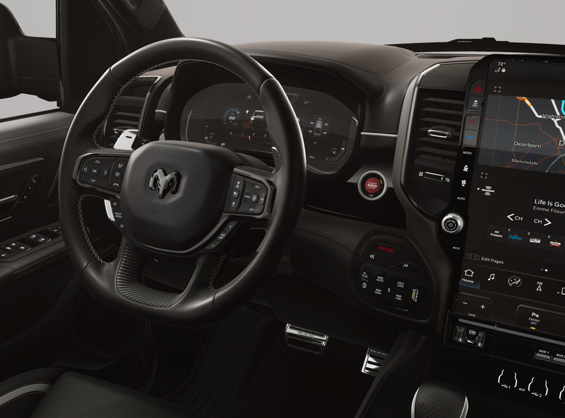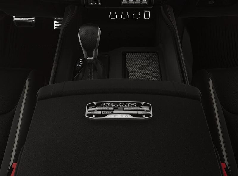 Bed Utility Group (Exterior 115V AC Outlet, MOPAR 4 Adjustable Cargo Tie-Down Hooks, and MOPAR Deployable Bed Step), Quick Order Package 22Y RHO, RHO Level 1 Equipment Group (12-Way/1-Way Trailer Connector, 14.4'' Touchscreen Display, 240 Amp Alternator, 4G LTE Wi-Fi Hot Spot, Connected Travel and Traffic Services, Connectivity - US/Canada, Disassociated Touchscreen Display, Driver Power Seat Back Massage, Driver Seat Memory, Driver/Passenger Wrapped Assist Handles, Drowsy Driver Detection, Dual Wireless Charging Pad, Evasive Steer Assist, Exterior Mirrors with Memory, Front Passenger Interactive Display, Front Passenger Power Seat Back Massage, Full Length Premium Upgraded Floor Console, GPS Navigation, Hands-Free Active Driving Assist System, Harman/Kardon 19 Speaker Premium Sound, HD Radio, Heads-Up Display, Heated Second Row Seats, Integrated Center Stack Radio, Integrated Voice Command with Bluetooth, Intersection Collision Assist System, Leather/Carbon Flat-Bottom Steering Wheel, LED CHMSL Lamp, Luxury Front Door Trim Panel, Power Adjustable Pedals with Memory, Power Tailgate, Premium Wrapped Instrument Panel Bezel, Radio: Uconnect 5 Nav with 14.4'' Display, Radio/Driver Seat/Mirrors/Pedals Memory, Rain Sensitive Windshield Wipers, Real Carbon Fiber Interior Accents, Rear 60/40 Folding Split Recline Seat, SiriusXM Radio Service, Smartphone as a Key Capable, Surround View Camera System, Traffic Sign Recognition, USB Host Flip, Ventilated Front Seats, and Ventilated Rear Seats), 10 Speakers, 3.92 Rear Axle Ratio, 4-Wheel Disc Brakes, ABS brakes, Adaptive suspension, Adjustable pedals, Air Conditioning, Alloy wheels, AM/FM radio, Apple CarPlay/Android Auto, Auto High-beam Headlights, Auto Power-Folding Mirrors, Auto-dimming door mirrors, Auto-Dimming Exterior Driver Mirror, Auto-dimming Rear-View mirror, Automatic temperature control, Brake assist, Compass, Delay-off headlights, Dome Dual LED Reading Lamp, Driver door bin, Driver vanity mirror, Dual front impact airbags, Dual front side impact airbags, Dual-Pane Panoramic Sunroof, Electronic Stability Control, Exterior Mirrors Courtesy Lamps, Exterior Mirrors with Heating Element, Exterior Mirrors with Supplemental Signals, Exterior Parking Camera Rear, Flareside Box, Front anti-roll bar, Front Bucket Seats, Front Center Armrest w/Storage, Front dual zone A/C, Front fog lights, Front License Plate Bracket, Front reading lights, Front wheel independent suspension, Fully automatic headlights, Garage door transmitter, Heated door mirrors, Heated front seats, Heated steering wheel, Illuminated entry, Leather Shift Knob, Leather steering wheel, Leather Trimmed Bucket Seats, Low tire pressure warning, Manufacturer's Statement of Origin, MOPAR Off-Road Style Running Boards, Navigation System, Occupant sensing airbag, Outside temperature display, Overhead airbag, Overhead console, Panic alarm, Passenger door bin, Passenger vanity mirror, Power door mirrors, Power driver seat, Power passenger seat, Power steering, Power windows, Radio data system, Radio: Uconnect 5 Navigation with 12.0'' Display, Rear reading lights, Rear seat center armrest, Rear step bumper, Rear window defroster, Remote keyless entry, Security system, Speed control, Split folding rear seat, Sport steering wheel, Steering wheel mounted audio controls, Tachometer, Telescoping steering wheel, Tilt steering wheel, Traction control, Trip computer, Turn signal indicator mirrors, Variably intermittent wipers, Voltmeter, and Wheels: 18'' x 9'' Black Paint/Polish Aluminum.