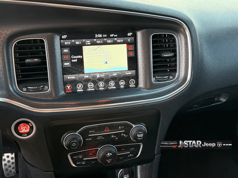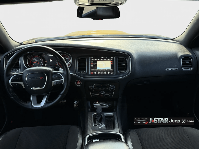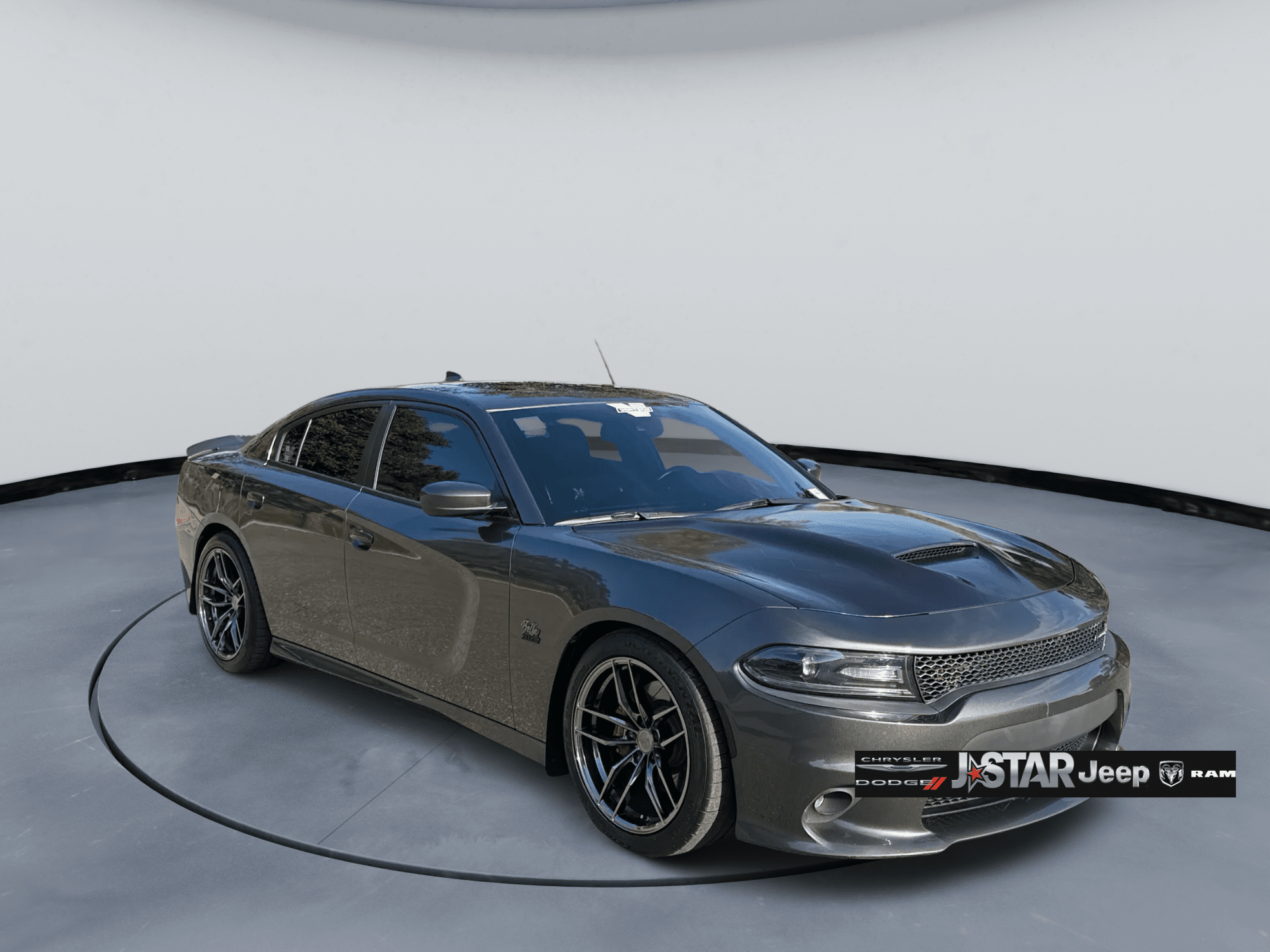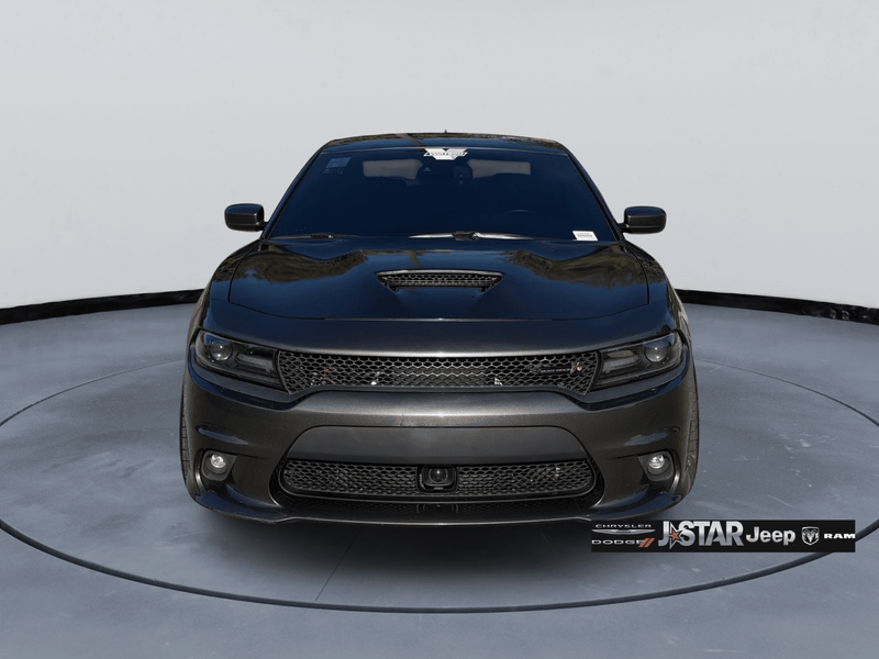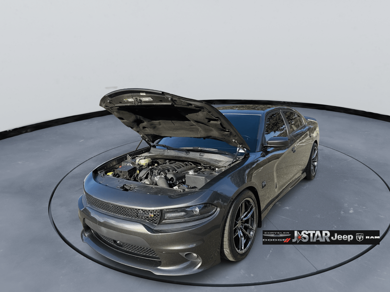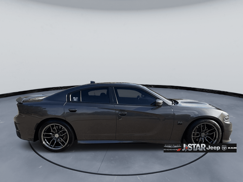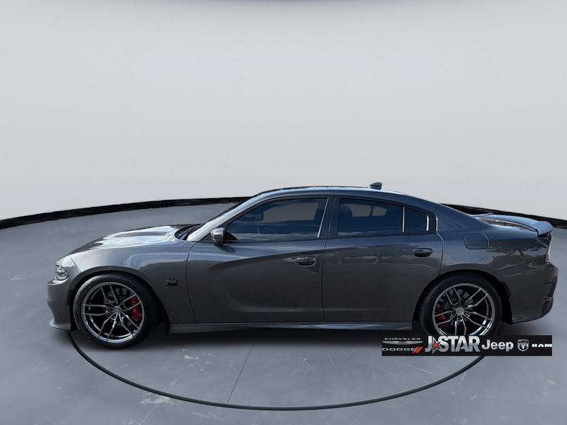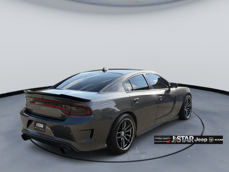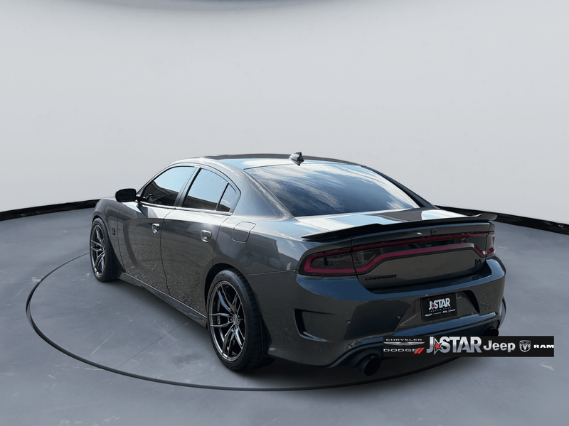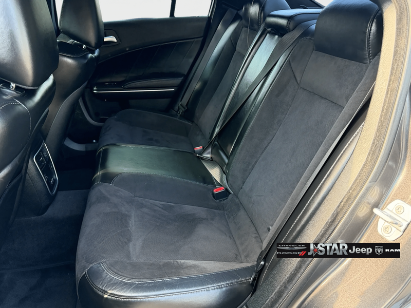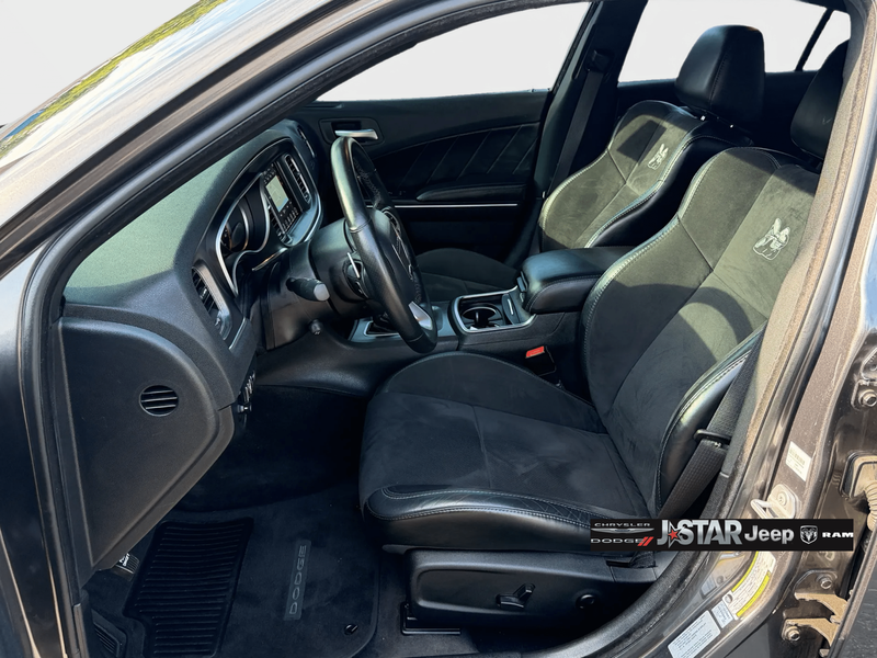 2017 Granite Crystal Metallic Clearcoat Dodge Charger R/T Scat Pack RWD is well equipped and includes these features and benefits: Beats Audio Group (552 Watt Amplifier), Driver Confidence Group (Blind Spot Power Heated Mirror and ParkSense Rear Park Assist System), Quick Order Package 21W R/T Scat Pack, Technology Group (Blind Spot & Cross Path Detection, Exterior Mirrors Courtesy Lamps, Lane Departure Warning Plus, and Rain Sensitive Windshield Wipers), Black Leather, 1-Yr SiriusXM Guardian Trial, 4-Wheel Disc Brakes, 6 Speakers, 8.4'' Touchscreen Display, ABS brakes, Air Conditioning, Alloy wheels, AM/FM radio: SiriusXM, Anti-whiplash front head restraints, Apple CarPlay/Android Auto, Auto-Dimming Exterior Driver Mirror, Auto-dimming Rear-View mirror, Automatic temperature control, Brake assist, Bumpers: body-color, Cloth Performance Seats, Compass, Delay-off headlights, Driver door bin, Driver vanity mirror, Dual front impact airbags, Dual front side impact airbags, Electronic Stability Control, Emergency communication system: Uconnect Access, Exterior Mirrors w/Heating Element, For Details, Visit DriveUconnect.com, Four wheel independent suspension, Front anti-roll bar, Front Bucket Seats, Front Center Armrest, Front dual zone A/C, Front fog lights, Front reading lights, Fully automatic headlights, Garage door transmitter: HomeLink, Google Android Auto, GPS Antenna Input, HD Radio, Illuminated entry, Integrated Voice Command w/Bluetooth, Leather Shift Knob, Low tire pressure warning, Manufacturer's Statement of Origin, Media Hub (2 USB, AUX), Occupant sensing airbag, Outside temperature display, Overhead airbag, Overhead console, Panic alarm, ParkView Rear Back-Up Camera, Passenger door bin, Passenger vanity mirror, Power door mirrors, Power driver seat, Power Driver/Passenger 4-Way Lumbar Adjust, Power passenger seat, Power steering, Power Sunroof, Power Tilt/Telescope Steering Column, Power windows, Radio data system, Radio: Uconnect 4C Nav w/8.4'' Display, Radio: Uconnect 4C w/8.4'' Display, Radio/Driver Seat/Mirrors Memory, Rear anti-roll bar, Rear reading lights, Rear seat center armrest, Rear window defroster, Remote keyless entry, Rhombi 2-Pc Wheel Center Cap, Security system, SiriusXM Satellite Radio, Speed control, Speed-Sensitive Wipers, Split folding rear seat, Spoiler, Steering wheel mounted audio controls, Tachometer, Telescoping steering wheel, Tilt steering wheel, Traction control, Trip computer, Variably intermittent wipers, and Wheels: 20'' x 9.0'' Alum Machined Face/Satin BlacK. Black Leather. Awards: