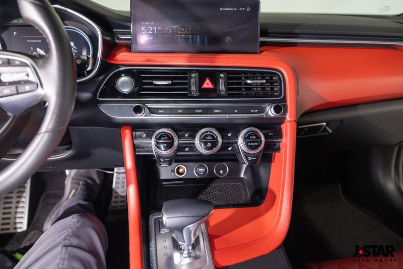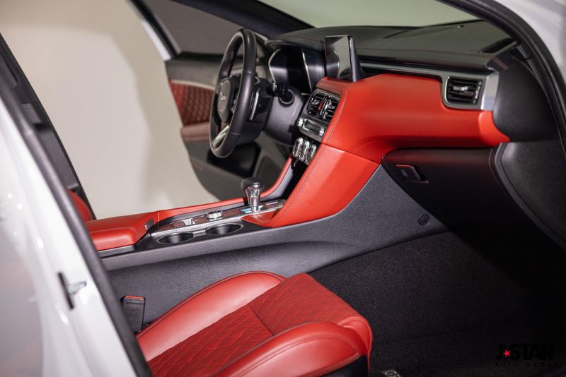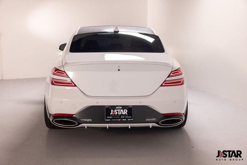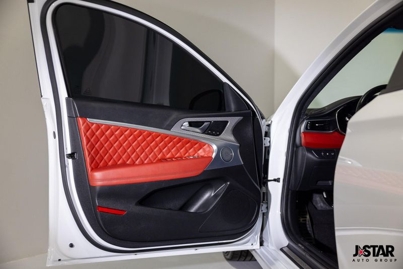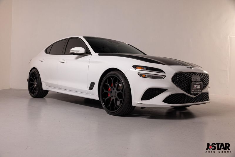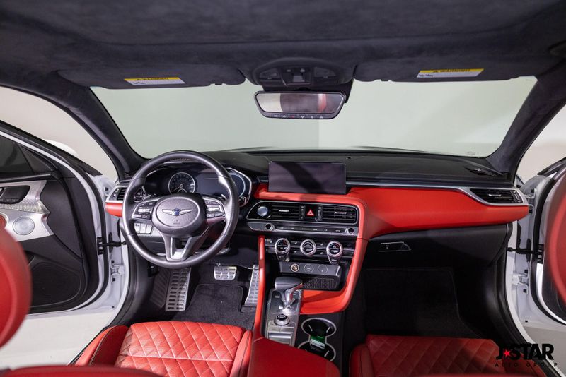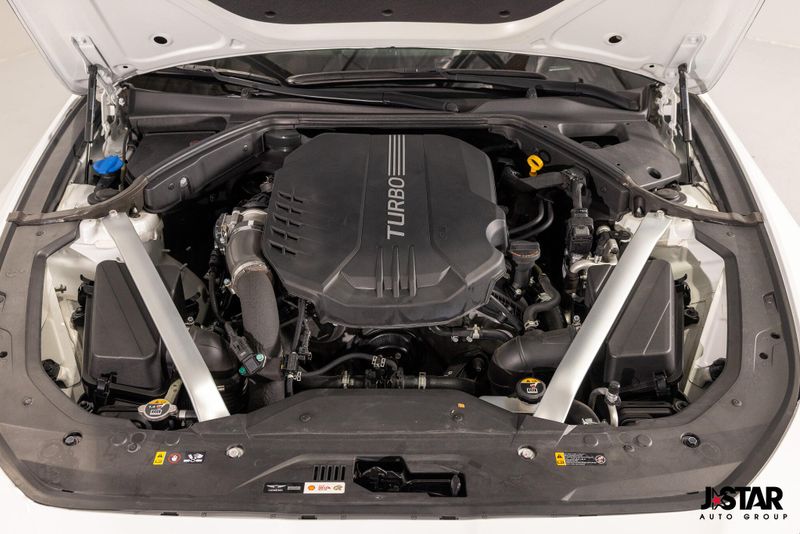 2023 White Genesis G70 3.3T RWD is well equipped and includes these features and benefits: Sport Advanced Package (Acoustic Front Door Glass, Alloy Pedals, Dark Chrome Grille & Daylight Opening Trim, Forward & Reverse Parking Distance Warning, Genesis Digital Key, Power Driver Seat Bolster & Cushion Extension, Radio: AM/FM/SiriusXM/HD Lexicon Prem Audio System, Sport Aluminum Trim, Variable Exhaust Valve System, Ventilated Front Seats, Wheels: 19'' x 8.0J Fr & 19'' x 8.5J Rr Sport Alloy, Wide Sunroof, and Wireless Device Charging), Sport Prestige Package (Brembo Braking System, Electronically Controlled Suspension, Heads-Up Display (HUD), Limited-Slip Differential, Microfiber Suede Headliner & Pillars, Nappa Leather Seating Surfaces, Power Trunk, and Surround View Monitor w/Blind Spot View Monitor), 4-Wheel Disc Brakes, 6 Speakers, ABS brakes, Air Conditioning, Alloy wheels, AM/FM radio: SiriusXM, Android Auto & Apple CarPlay, Anti-whiplash front head restraints, Auto High-beam Headlights, Auto-dimming door mirrors, Auto-dimming Rear-View mirror, Automatic temperature control, Brake assist, Bumper Applique, Bumpers: body-color, Delay-off headlights, Driver door bin, Driver vanity mirror, Dual front impact airbags, Dual front side impact airbags, Electronic Stability Control, Emergency communication system: Genesis Connected Services, Exterior Parking Camera Rear, Four wheel independent suspension, Front anti-roll bar, Front Bucket Seats, Front Center Armrest, Front dual zone A/C, Front reading lights, Fully automatic headlights, Garage door transmitter: HomeLink, Heated door mirrors, Heated front seats, Heated Multi-Adjustable Front Bucket Seats, Illuminated entry, Knee airbag, Leather Seating Surfaces, Low tire pressure warning, Memory seat, Navigation System, Occupant sensing airbag, Outside temperature display, Overhead airbag, Overhead console, Panic alarm, Passenger door bin, Passenger vanity mirror, Power door mirrors, Power driver seat, Power passenger seat, Power steering, Power windows, Premium First Aid Kit, Radio: AM/FM/SiriusXM/HD Audio System, Rain sensing wipers, Rear anti-roll bar, Rear reading lights, Rear seat center armrest, Rear window defroster, Remote keyless entry, Reversible Cargo Tray, Security system, Speed control, Speed-sensing steering, Speed-Sensitive Wipers, Split folding rear seat, Steering wheel memory, Steering wheel mounted audio controls, Tachometer, Telescoping steering wheel, Traction control, Trip computer, Turn signal indicator mirrors, Variably intermittent wipers, Wheel Locks, and Wheels: 19'' x 8.0J Fr & 19'' x 8.5J Rr Alloy.