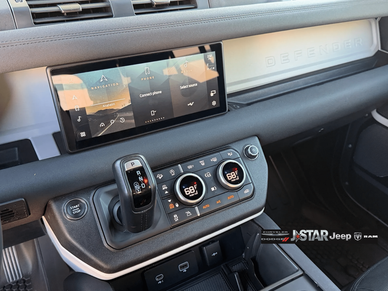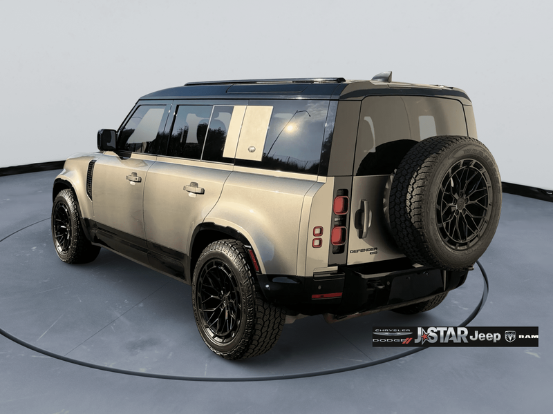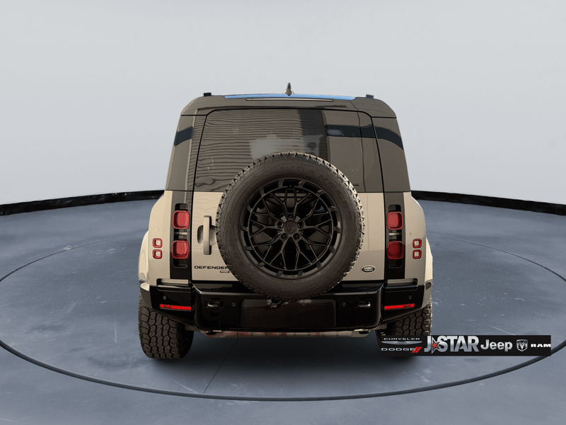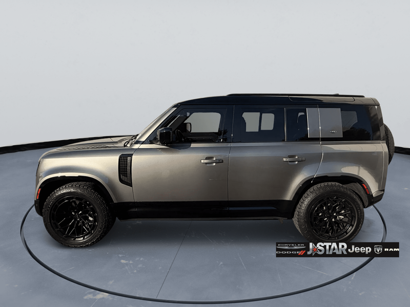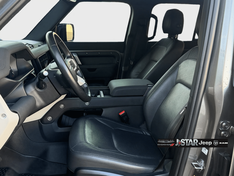 2023 Gray Land Rover Defender X-Dynamic SE 4WD is well equipped and includes these features and benefits: 12-Way Heated & Cooled Electric Memory Seats, 15 Speakers, 3.55 Axle Ratio, 4-Wheel Disc Brakes, ABS brakes, Air Conditioning, Alloy wheels, AM/FM radio: SiriusXM, Apple CarPlay & Android Auto, Auto High-beam Headlights, Auto-dimming door mirrors, Auto-dimming Rear-View mirror, Automatic temperature control, Brake assist, Bumpers: body-color, Compass, Delay-off headlights, Driver door bin, Driver vanity mirror, Dual front impact airbags, Dual front side impact airbags, Electronic Stability Control, Exterior Parking Camera Rear, Four wheel independent suspension, Front anti-roll bar, Front Bucket Seats, Front Center Armrest, Front dual zone A/C, Front fog lights, Front reading lights, Fully automatic headlights, Garage door transmitter: HomeLink, Grained Leather Seat Trim, Heated door mirrors, Heated front seats, Illuminated entry, Leather Shift Knob, Leather steering wheel, Low tire pressure warning, Memory seat, Navigation system: Connected Navigation PIVI Pro, Occupant sensing airbag, Outside temperature display, Overhead airbag, Overhead console, Panic alarm, Passenger door bin, Passenger vanity mirror, Power door mirrors, Power driver seat, Power moonroof, Power passenger seat, Power steering, Power windows, Radio data system, Radio: 700W 15 Speaker Meridian Surround Sound Sys, Rain sensing wipers, Rear anti-roll bar, Rear fog lights, Rear reading lights, Rear seat center armrest, Rear window defroster, Rear window wiper, Remote keyless entry, Security system, Speed control, Speed-sensing steering, Speed-Sensitive Wipers, Split folding rear seat, Steering wheel mounted audio controls, Tachometer, Telescoping steering wheel, Tilt steering wheel, Traction control, Trip computer, Variably intermittent wipers, Ventilated front seats, Weather band radio, and Wheels: 20'' Satin Dark Grey Style 5094.