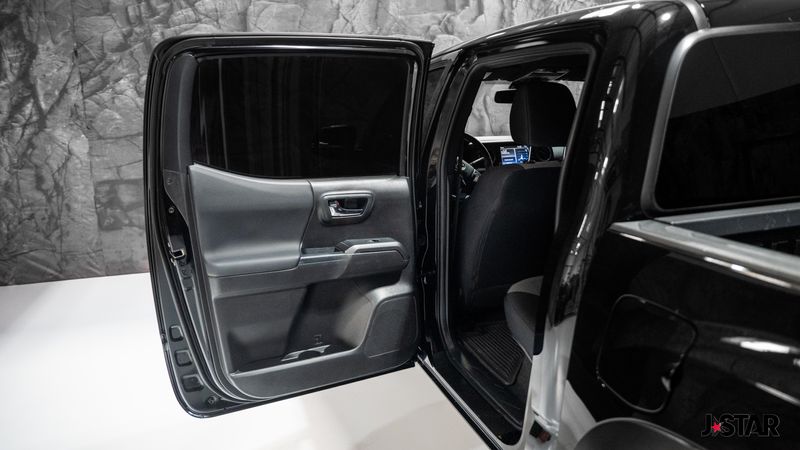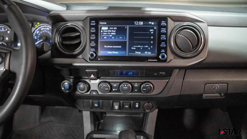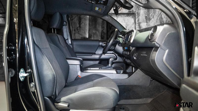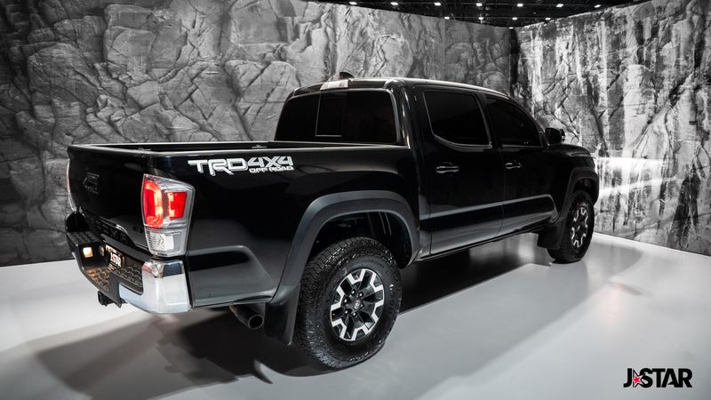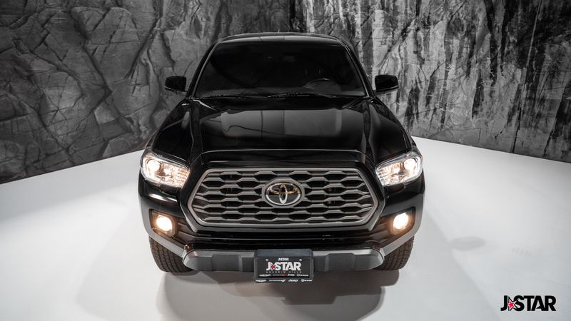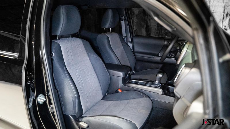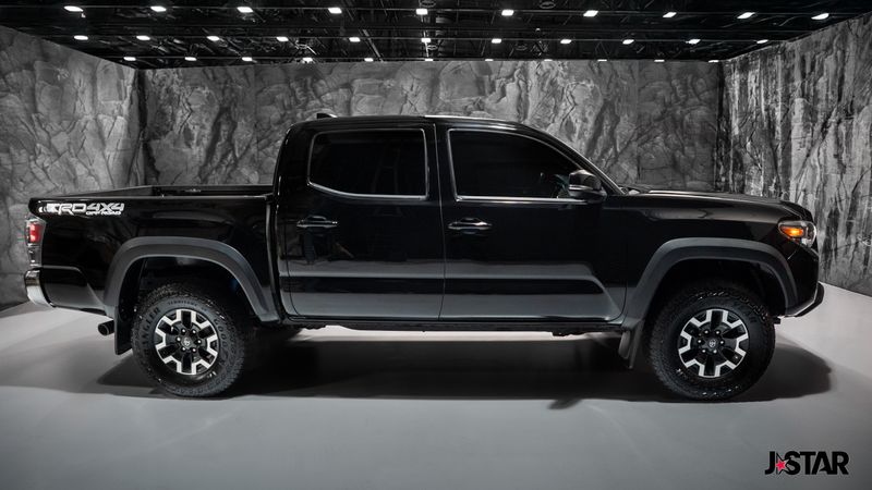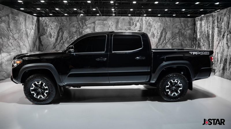 2023 Black Toyota Tacoma TRD Offroad 4WD is well equipped and includes these features and benefits: 4WD, ABS brakes, Alloy wheels, Electronic Stability Control, Front dual zone A/C, Heated door mirrors, Illuminated entry, Low tire pressure warning, Remote keyless entry, Traction control, 120V/400W Deck Mounted AC Power, 6 Speakers, Air Conditioning, AM/FM radio: SiriusXM, Anti-whiplash front head restraints, Apple CarPlay/Android Auto, Auto High-beam Headlights, Auto-dimming Rear-View mirror, Auto-Dimming Rearview Mirror w/HomeLink, Automatic temperature control, Black Overfenders, Brake assist, Bumpers: body-color, Driver door bin, Dual front impact airbags, Dual front side impact airbags, Emergency communication system: Safety Connect (1-year trial), Engine Immobilizer, Exterior Parking Camera Rear, Fabric Seat Trim, Front anti-roll bar, Front Bucket Seats, Front Center Armrest, Front fog lights, Front reading lights, Front Seats, Front wheel independent suspension, Garage door transmitter: HomeLink, Knee airbag, Leather Shift Knob, Occupant sensing airbag, Outside temperature display, Overhead airbag, Overhead console, Panic alarm, Passenger door bin, Power door mirrors, Power driver seat, Power Sliding Rear Window w/Privacy Glass, Power steering, Power windows, Radio: Audio, Rear step bumper, Security system, Speed control, Speed-sensing steering, Split folding rear seat, Steering wheel mounted audio controls, Tachometer, Telescoping steering wheel, Tilt steering wheel, Trip computer, Turn signal indicator mirrors, Variably intermittent wipers, and Wheels: 16'' Machined Contrast Alloy. 4WD, ABS brakes, Alloy wheels, Electronic Stability Control, Front dual zone A/C, Heated door mirrors, Illuminated entry, Low tire pressure warning, Remote keyless entry, Traction control.