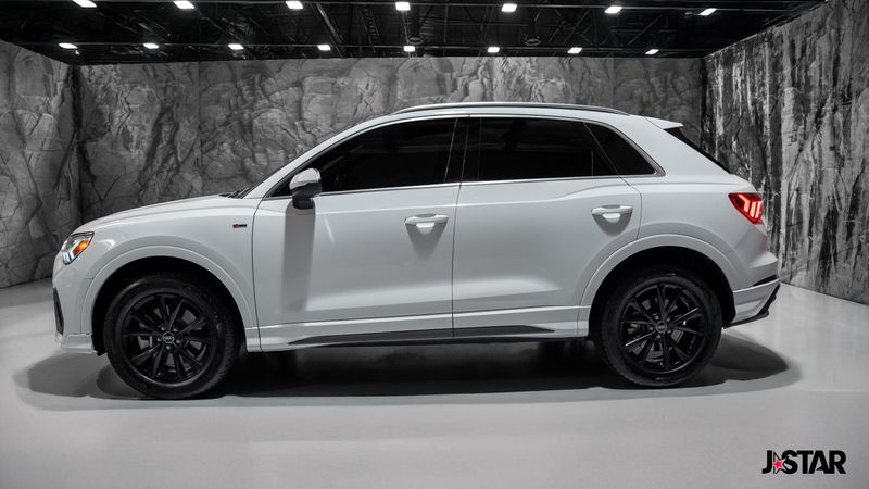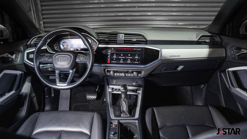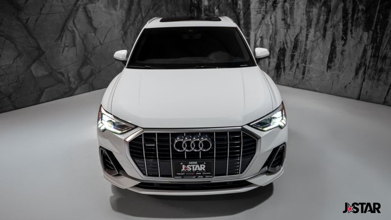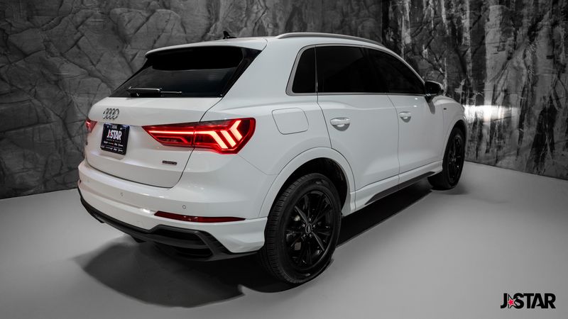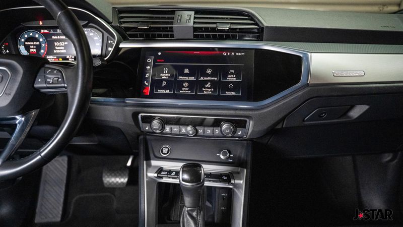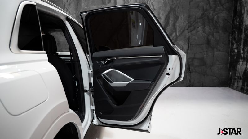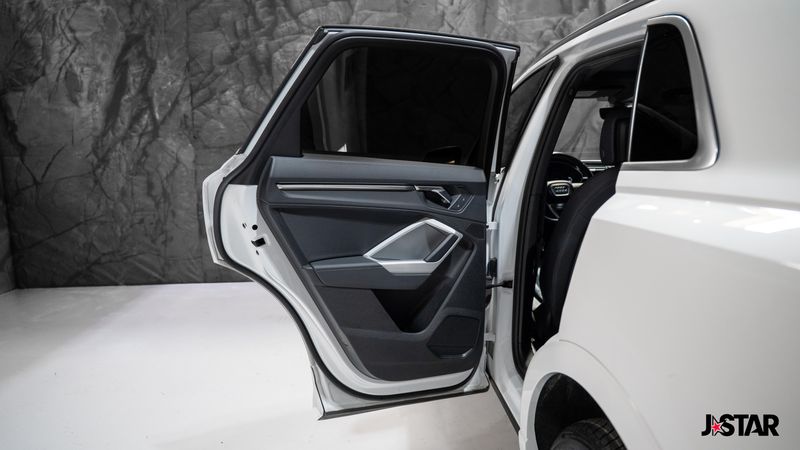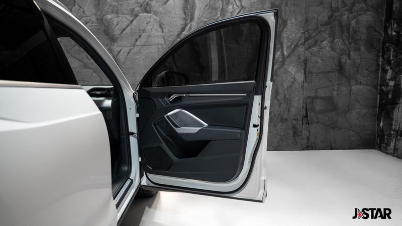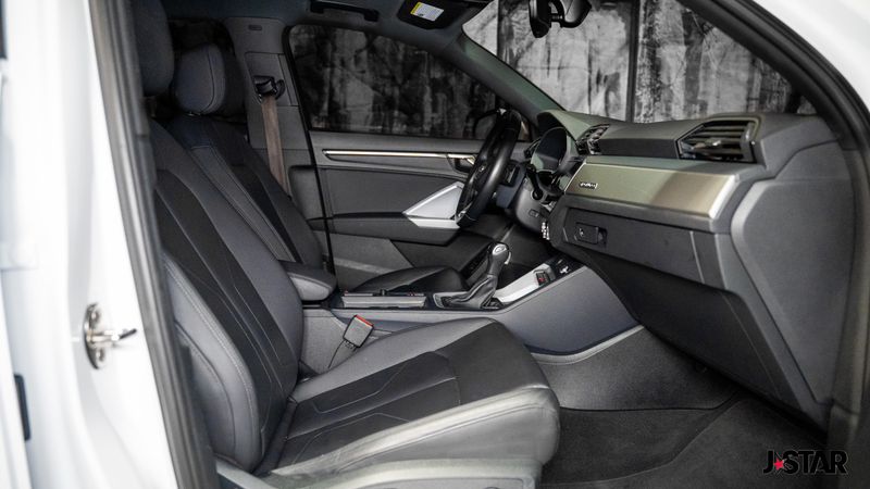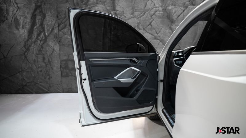 2024 White Audi Q3 Premium AWD is well equipped and includes these features and benefits: 10 Speakers, 3.53 Axle Ratio, 4-Wheel Disc Brakes, ABS brakes, Air Conditioning, Alloy wheels, AM/FM radio, Audi smartphone interface (Apple CarPlay/Android Auto), Auto High-beam Headlights, Automatic temperature control, Brake assist, Bumpers: body-color, Delay-off headlights, Driver door bin, Driver vanity mirror, Dual front impact airbags, Dual front side impact airbags, Electronic Stability Control, Emergency communication system: Audi connect CARE, Exterior Parking Camera Rear, Four wheel independent suspension, Front anti-roll bar, Front Bucket Seats, Front Center Armrest, Front dual zone A/C, Front fog lights, Front reading lights, Fully automatic headlights, Heated door mirrors, Heated Front Bucket Seats, Heated front seats, Illuminated entry, Knee airbag, Leather Seating Surfaces, Leather Shift Knob, Leather steering wheel, Low tire pressure warning, Occupant sensing airbag, Outside temperature display, Overhead airbag, Overhead console, Panic alarm, Passenger door bin, Passenger vanity mirror, Power door mirrors, Power driver seat, Power Liftgate, Power moonroof: Panoramic, Power passenger seat, Power steering, Power windows, Radio data system, Radio: Audi Sound System, Rain sensing wipers, Rear air conditioning, Rear anti-roll bar, Rear fog lights, Rear reading lights, Rear seat center armrest, Rear window defroster, Rear window wiper, Remote keyless entry, Speed control, Speed-sensing steering, Split folding rear seat, Spoiler, Steering wheel mounted audio controls, Tachometer, Telescoping steering wheel, Tilt steering wheel, Traction control, Trip computer, Turn signal indicator mirrors, Variably intermittent wipers, and Wheels: 18'' 5-V-Spoke-S Design.