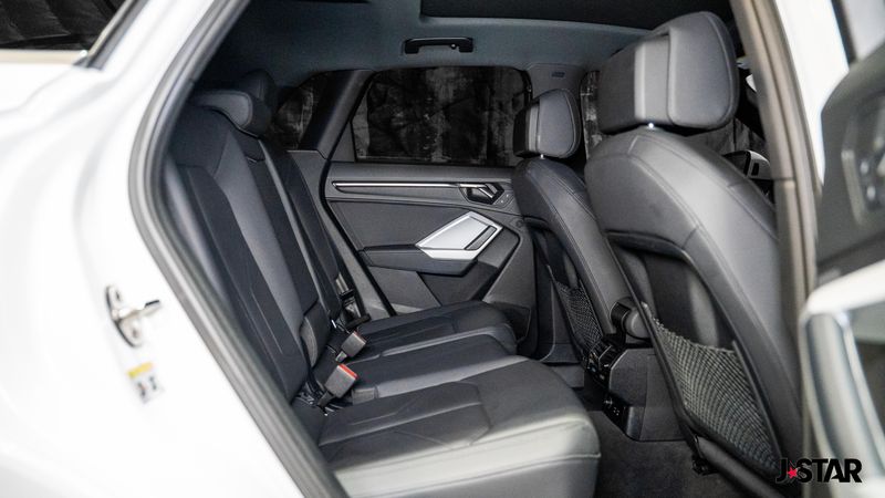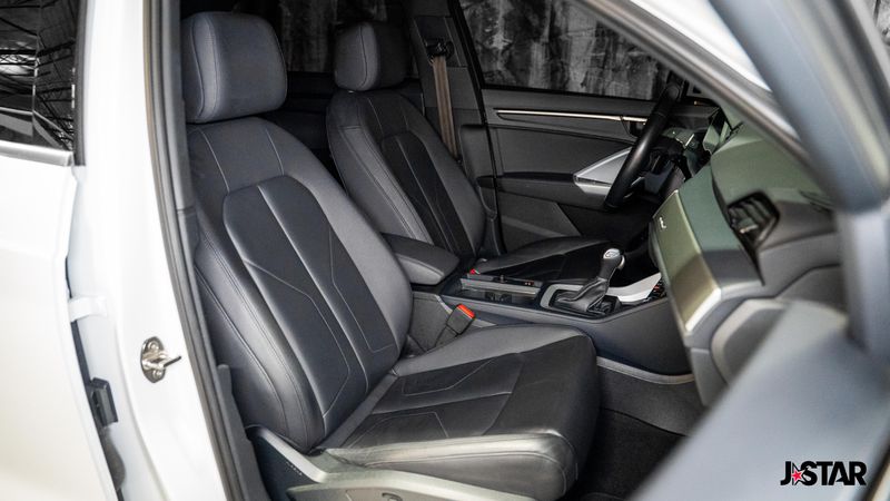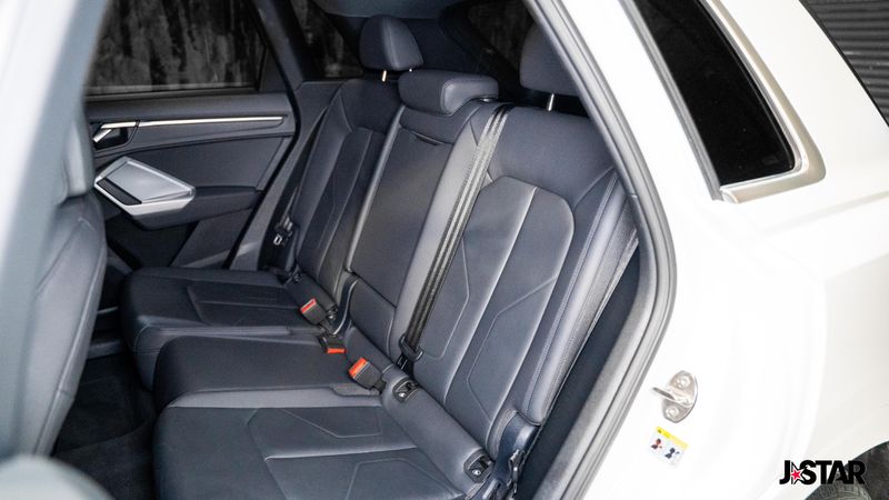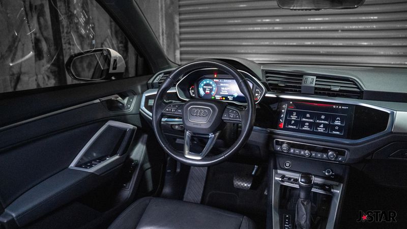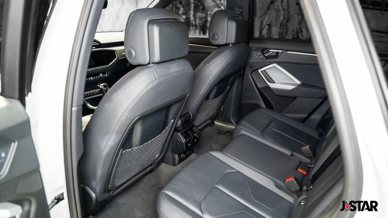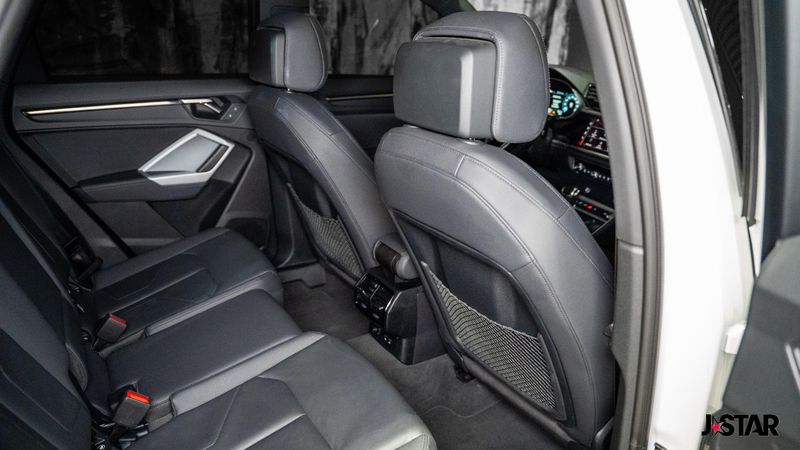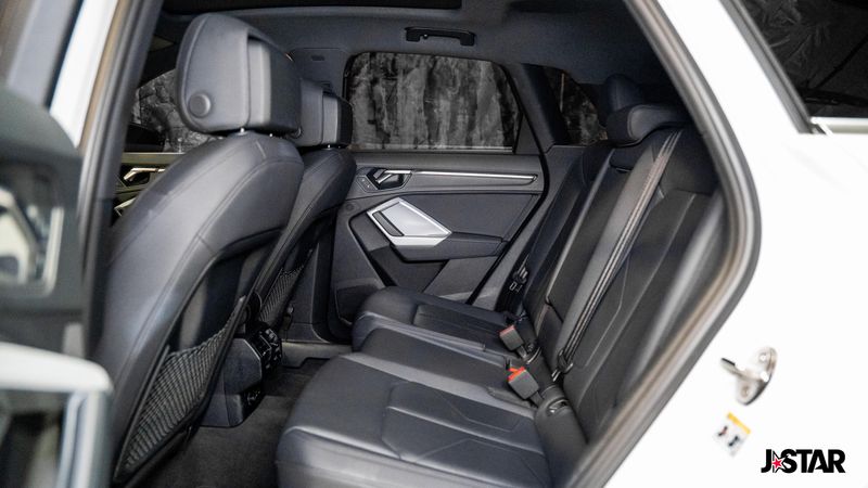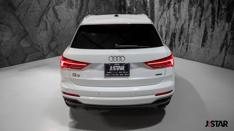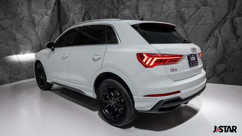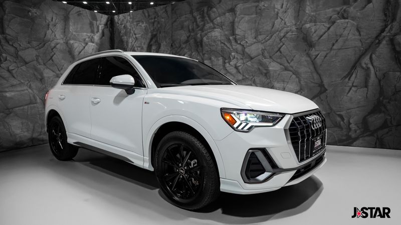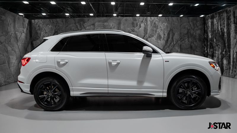 2024 White Audi Q3 Premium AWD is well equipped and includes these features and benefits: 10 Speakers, 3.53 Axle Ratio, 4-Wheel Disc Brakes, ABS brakes, Air Conditioning, Alloy wheels, AM/FM radio, Audi smartphone interface (Apple CarPlay/Android Auto), Auto High-beam Headlights, Automatic temperature control, Brake assist, Bumpers: body-color, Delay-off headlights, Driver door bin, Driver vanity mirror, Dual front impact airbags, Dual front side impact airbags, Electronic Stability Control, Emergency communication system: Audi connect CARE, Exterior Parking Camera Rear, Four wheel independent suspension, Front anti-roll bar, Front Bucket Seats, Front Center Armrest, Front dual zone A/C, Front fog lights, Front reading lights, Fully automatic headlights, Heated door mirrors, Heated Front Bucket Seats, Heated front seats, Illuminated entry, Knee airbag, Leather Seating Surfaces, Leather Shift Knob, Leather steering wheel, Low tire pressure warning, Occupant sensing airbag, Outside temperature display, Overhead airbag, Overhead console, Panic alarm, Passenger door bin, Passenger vanity mirror, Power door mirrors, Power driver seat, Power Liftgate, Power moonroof: Panoramic, Power passenger seat, Power steering, Power windows, Radio data system, Radio: Audi Sound System, Rain sensing wipers, Rear air conditioning, Rear anti-roll bar, Rear fog lights, Rear reading lights, Rear seat center armrest, Rear window defroster, Rear window wiper, Remote keyless entry, Speed control, Speed-sensing steering, Split folding rear seat, Spoiler, Steering wheel mounted audio controls, Tachometer, Telescoping steering wheel, Tilt steering wheel, Traction control, Trip computer, Turn signal indicator mirrors, Variably intermittent wipers, and Wheels: 18'' 5-V-Spoke-S Design.