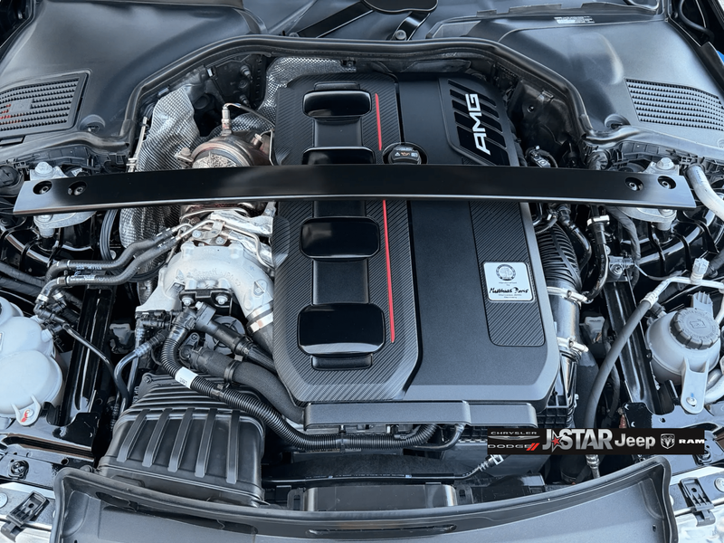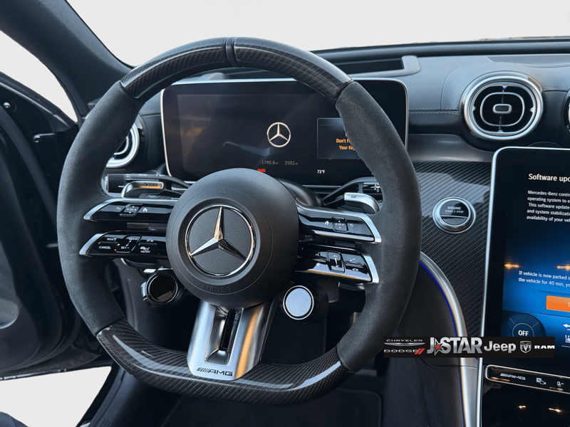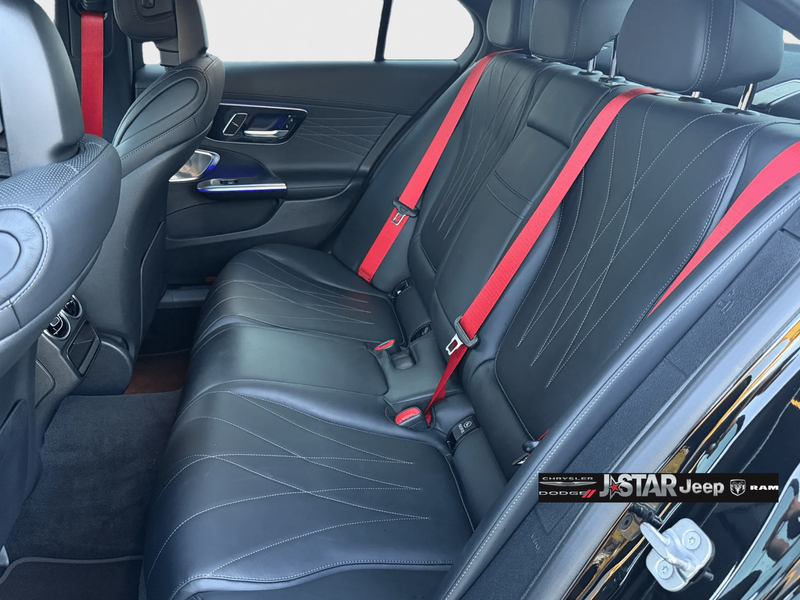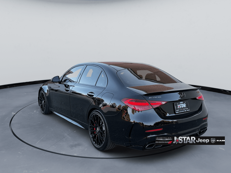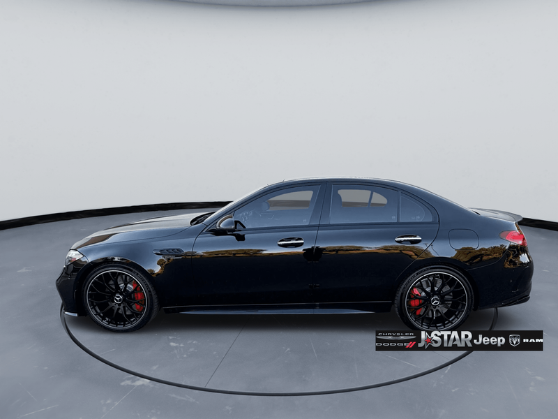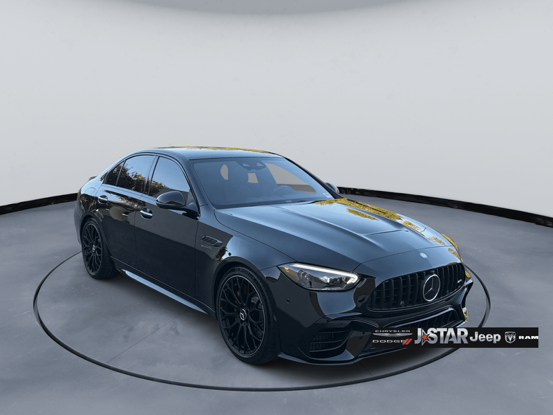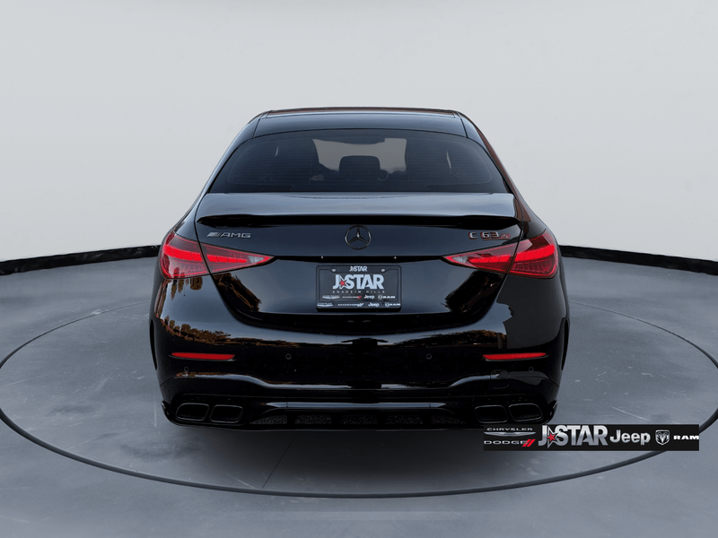 2024 Black Mercedes-Benz C 63 S AMG AWD is well equipped and includes these features and benefits: Advanced USB Package, AMG Aerodynamics Package, AMG Night Package, AMG Night Package Components, AMG Night Package Plus (Darkened Front Grille and Darkened Model Badging), AMG Performance Design Package (AMG Track Pace, Performance-Oriented Body Styling, Red Brake Calipers, and Top Speed Delimiter to 174 MPH), Driver Assistance Package (Active Lane Change Assist, Active Speed Limit Assist, DISTRONIC PLUS w/Steering & Stop & Go Assist, PRE-SAFE Impulse Side, PRE-SAFE PLUS, and Route-Based Speed Adaptation), Driver Assistance Package Plus, Pinnacle Trim Package (Augmented Video for Navigation, DIGITAL LIGHT w/Projections, and Head-Up Display w/AMG Specific Content), 2.0L I4 Turbocharged, 4MATIC, 15 Speakers, 4-Wheel Disc Brakes, ABS brakes, Adaptive suspension, Air Conditioning, Alloy wheels, AM/FM radio: SiriusXM, AMG Fuel Cap, AMG Perf. Carbon Fiber/Microfiber Steering Wheel, AMG Star Set, Apple CarPlay/Android Auto, Auto High-beam Headlights, Auto tilt-away steering wheel, Auto-dimming door mirrors, Auto-dimming Rear-View mirror, Automatic temperature control, Brake assist, Bumpers: body-color, Compass, Dashcam, Delay-off headlights, Driver door bin, Driver vanity mirror, Dual front impact airbags, Dual front side impact airbags, Electronic Stability Control, Emergency communication system: Mercedes-Benz Emergency Call Service, Exterior Parking Camera Rear, Four wheel independent suspension, Front anti-roll bar, Front Bucket Seats, Front Center Armrest, Front dual zone A/C, Front reading lights, Fully automatic headlights, Garage door transmitter: HomeLink, Genuine wood dashboard insert, Head restraints memory, Heated door mirrors, Heated front seats, Illuminated entry, Knee airbag, Leather steering wheel, Low tire pressure warning, MB Navigation, MB-Tex/Microfiber Upholstery, Memory seat, Navigation system: MB Navigation, Occupant sensing airbag, Outside temperature display, Overhead airbag, Overhead console, Panic alarm, Passenger door bin, Passenger vanity mirror, Piano Black Lacquer Center Console, Power adjustable front head restraints, Power door mirrors, Power driver seat, Power Heated Front Seats w/Memory, Power moonroof: Panorama, Power passenger seat, Power steering, Power windows, Premium audio system: MBUX, Radio data system, Radio: Burmester 3D Surround Sound System, Rain sensing wipers, Rear anti-roll bar, Rear fog lights, Rear reading lights, Rear seat center armrest, Rear window defroster, Red Seatbelts, Remote keyless entry, Security system, Speed control, Speed-sensing steering, Split folding rear seat, Spoiler, Sport steering wheel, Steering wheel memory, Steering wheel mounted audio controls, Tachometer, Telescoping steering wheel, Tilt steering wheel, Traction control, Trip computer, Turn signal indicator mirrors, Variably intermittent wipers, Ventilated Front Seats, Weather band radio, Wheels: 19'' x 9.5J AMG Twin 5-Spoke, and Wheels: 20'' x 9.5J AMG Forged Black Y-Design. 2.0L I4 Turbocharged, 4MATIC.