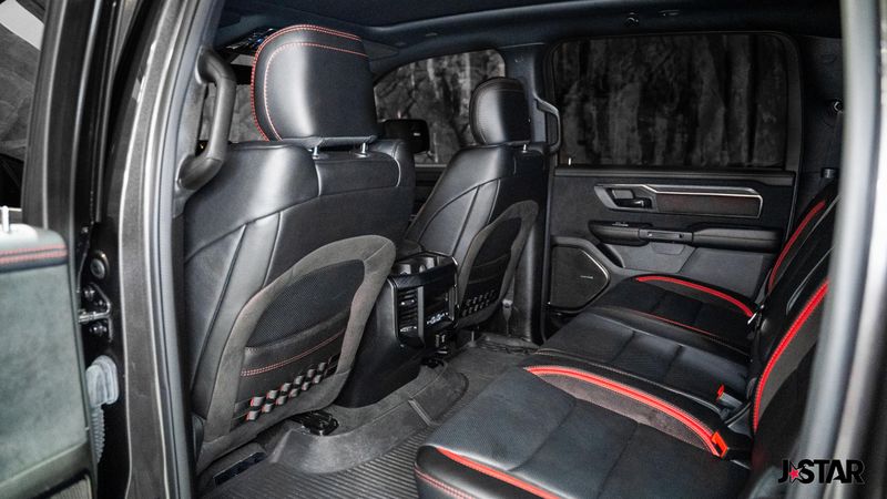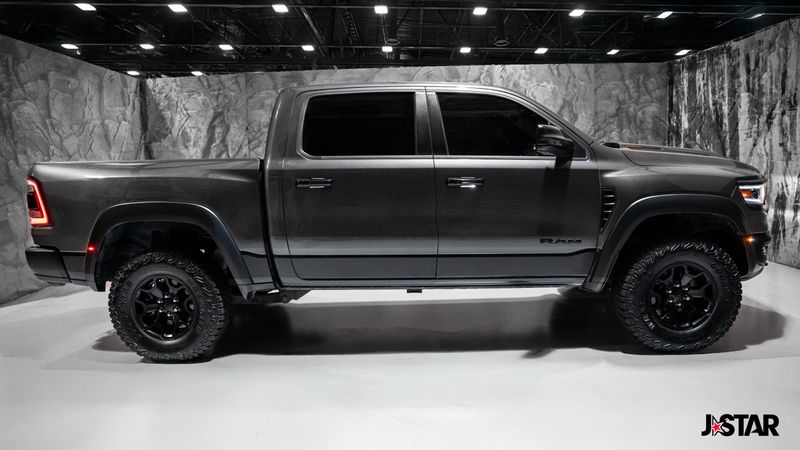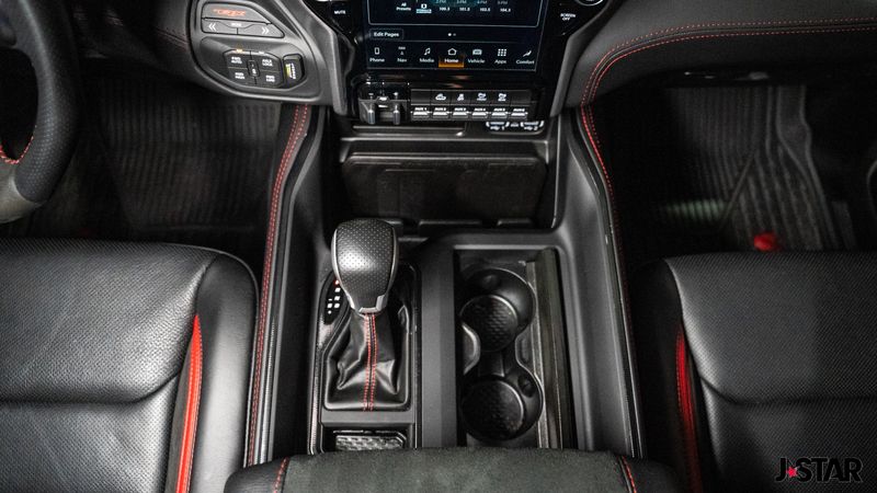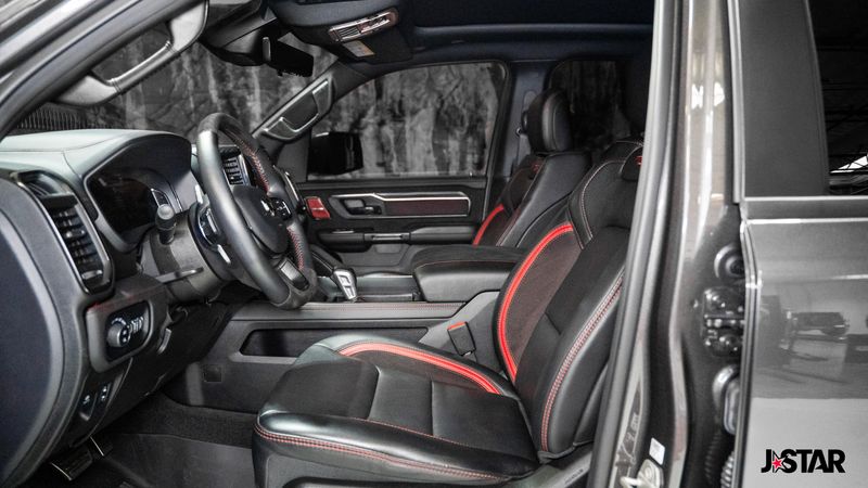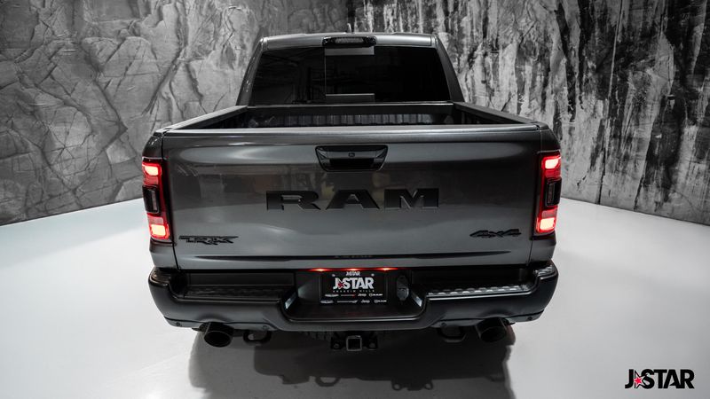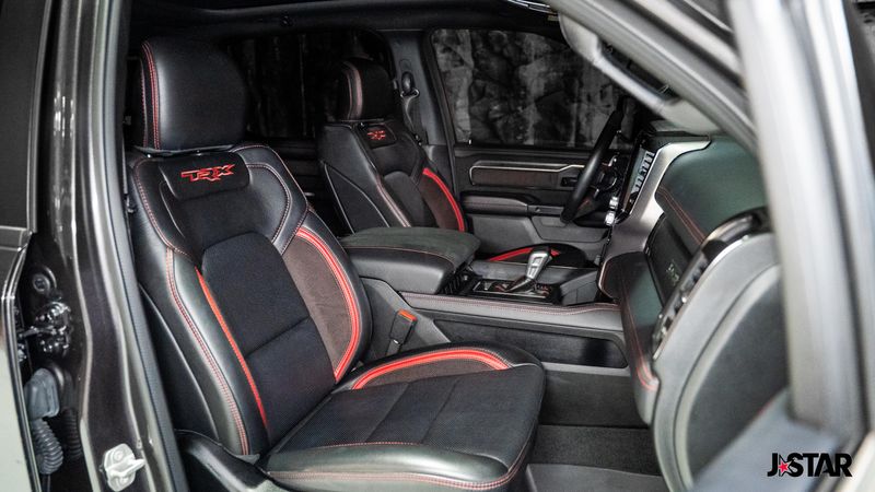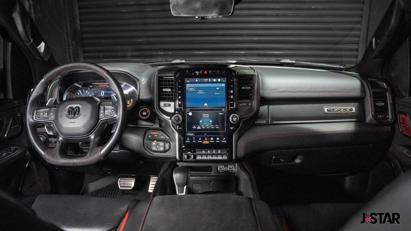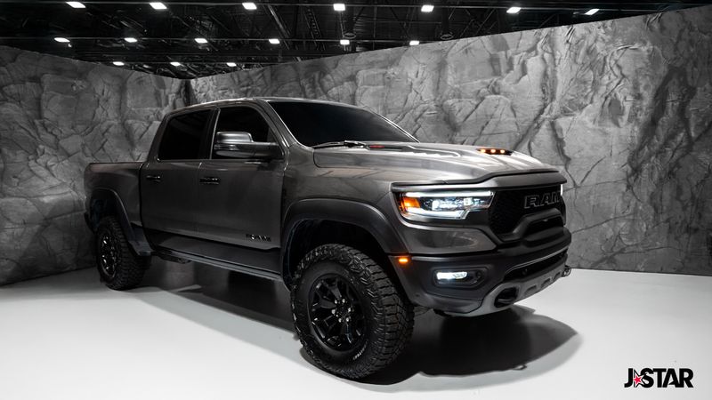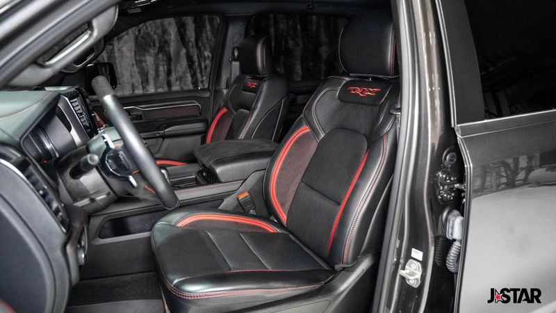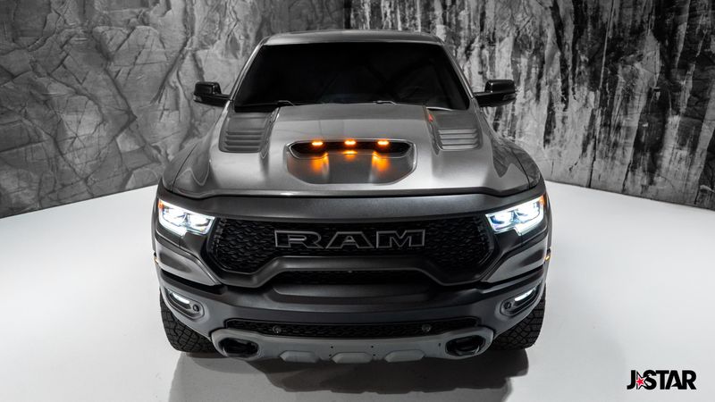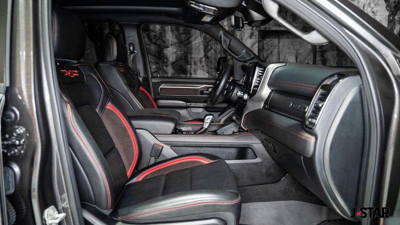 2024 Granite Crystal Metallic Clearcoat Ram 1500 TRX 4WD is well equipped and includes these features and benefits: Advanced Safety Group (Adaptive Cruise Control w/Stop & Go, Lane Keep Assist, and Pedestrian Emergency Braking), Quick Order Package 29Y TRX, TRX Level 2 Equipment Group (#2 Seat Foam Cushion, 2-Door Passive Entry, Front Door Locks, 4 Way Front Headrests, Accent Color Door Handles, Blind Spot & Cross Path Detection, Bucket Seats, Digital Rearview Mirror, Driver Seat Memory, Driver/Passenger Wrapped Assist Handles, Exterior Mirrors w/Memory, Front Door Accent Lighting, Front Seat Back Map Pockets, Full Length Premium Upgraded Floor Console, harman/kardon 19 Speaker Premium Sound, Heads-Up Display, Heated Front Seats, Heated Second Row Seats, Heated Steering Wheel, IP LED Ambient Light Pipe, Leather Trimmed Bucket Seats, Leather/Suede Flat-Bottom Steering Wheel, LED CHMSL Lamp, Luxury Front Door Trim Panel, MOPAR Bright Pedal Kit, ParkSense Front/Rear Park Assist w/Stop, Pick-Up Box Lighting, Power 4-Way Driver Lumbar Adjust, Power 4-Way Passenger Lumbar Adjust, Power 8-Way Driver & Passenger Seats, Power Adjustable Pedals w/Memory, Premium Wrapped IP Bezel, Radio/Driver Seat/Mirrors/Pedals Memory, Rain Sensitive Windshield Wipers, Rear 60/40 Folding Seat, Rear 60/40 Folding Split Recline Seat, Rear Door Accent Lighting, Rear Underseat Compartment Storage, Rear Window Defroster, Remote Tailgate Release, Sun Visors w/Illuminated Vanity Mirrors, Surround View Camera System, Trailer Brake Control, Universal Garage Door Opener, Ventilated Front Seats, Ventilated Rear Seats, and Wireless Charging Pad), 10 Speakers, 3.55 Rear Axle Ratio, 4-Wheel Disc Brakes, ABS brakes, Adaptive suspension, Air Conditioning, Alloy wheels, AM/FM radio: SiriusXM with 360L, Apple CarPlay/Android Auto, Auto High-beam Headlights, Auto-dimming door mirrors, Auto-dimming Rear-View mirror, Automatic temperature control, Brake assist, Cloth/Vinyl Bucket Seats, Compass, Delay-off headlights, Dome Dual LED Reading Lamp, Driver door bin, Dual front impact airbags, Dual front side impact airbags, Dual-Pane Panoramic Sunroof, Electronic Stability Control, Exterior Mirrors Courtesy Lamps, Exterior Mirrors w/Heating Element, Exterior Mirrors w/Supplemental Signals, Front anti-roll bar, Front Bucket Seats, Front Center Armrest w/Storage, Front dual zone A/C, Front fog lights, Front License Plate Bracket, Front reading lights, Front wheel independent suspension, Fully automatic headlights, Heated door mirrors, Illuminated entry, Leather Shift Knob, Leather steering wheel, Low tire pressure warning, Navigation System, Occupant sensing airbag, Outside temperature display, Overhead airbag, Overhead console, Panic alarm, ParkView Rear Back-Up Camera, Passenger door bin, Passenger vanity mirror, Power door mirrors, Power driver seat, Power steering, Power windows, Power-Folding Mirrors, Radio data system, Radio: Uconnect 5 Nav w/12.0'' Display, Rear seat center armrest, Rear step bumper, Remote keyless entry, Security system, Speed control, Split folding rear seat, Sport steering wheel, Steering wheel mounted audio controls, Tachometer, Telescoping steering wheel, Tilt steering wheel, Traction control, Trip computer, TRX Red Interior Accents, Turn signal indicator mirrors, Variably intermittent wipers, Voltmeter, and Wheels: 18'' x 9'' Black Paint/Polish Aluminum.