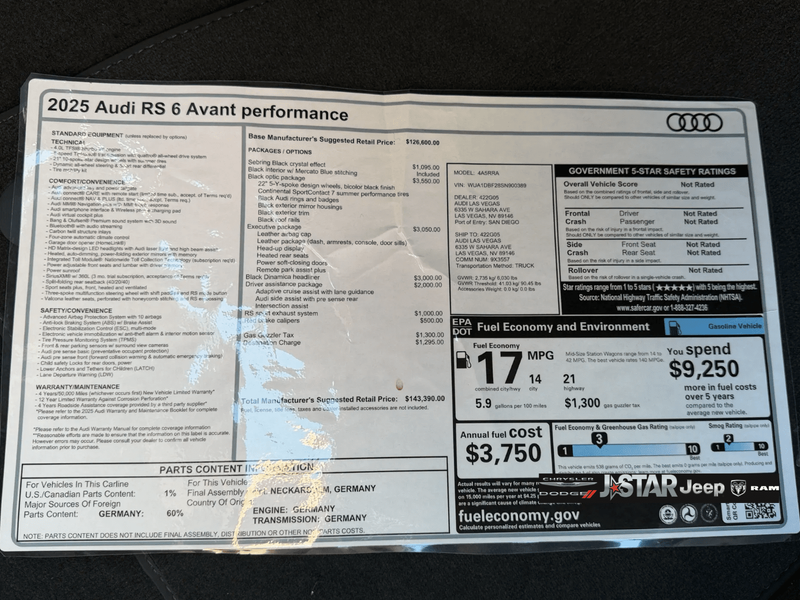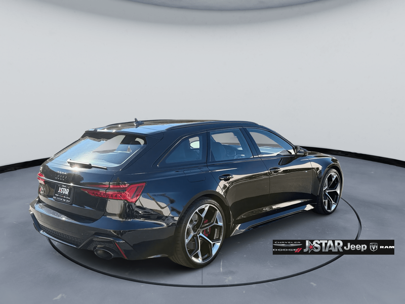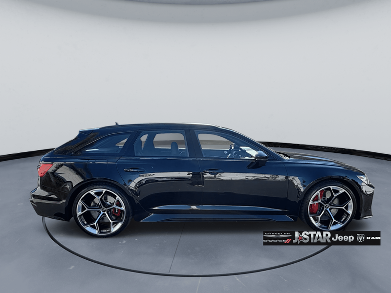 2025 Black Crystal Audi RS 6 Avant performance 4.0T AWD is well equipped and includes these features and benefits: Black Optic Package (Black Exterior Mirror Housings, Black Exterior Trim, Black Roof Rails, and Wheels: 22'' Bi-Color Finish 5-Y-Spoke Design), Driver Assistance Package (Intersection Assist), Executive Package (Head-Up Display, Heated Rear Seats, Power Soft-Closing Doors, and Remote Park Assist Plus), Leather Package, 16 Speakers, 4-Wheel Disc Brakes, ABS brakes, Adaptive suspension, Air Conditioning, Alloy wheels, Auto High-beam Headlights, Auto tilt-away steering wheel, Auto-dimming door mirrors, Auto-dimming Rear-View mirror, Auto-leveling suspension, Automatic temperature control, Brake assist, Bumpers: body-color, Compass, Delay-off headlights, Dinamica Headliner, Driver door bin, Driver vanity mirror, Dual front impact airbags, Dual front side impact airbags, Electronic Stability Control, Emergency communication system: Audi connect CARE (limited time subscription - acceptance of terms required), Exterior Parking Camera Rear, Four wheel independent suspension, Front anti-roll bar, Front Bucket Seats, Front Center Armrest, Front dual zone A/C, Front fog lights, Front reading lights, Garage door transmitter: HomeLink, Headlight cleaning, Heated door mirrors, Heated front seats, Heated steering wheel, Illuminated entry, Knee airbag, Leather Shift Knob, Leather steering wheel, Low tire pressure warning, Memory seat, Navigation system: Audi MMI Navigation plus with Touch Response, Occupant sensing airbag, Outside temperature display, Overhead airbag, Overhead console, Panic alarm, Passenger door bin, Passenger vanity mirror, Power door mirrors, Power driver seat, Power Liftgate, Power moonroof, Power passenger seat, Power steering, Power windows, Radio data system, Rain sensing wipers, Rear air conditioning, Rear anti-roll bar, Rear dual zone A/C, Rear reading lights, Rear seat center armrest, Rear side impact airbag, Rear window defroster, Rear window wiper, Red Brake Calipers, Remote keyless entry, RS Sport Exhaust System, Security system, Speed control, Speed-sensing steering, Speed-Sensitive Wipers, Split folding rear seat, Spoiler, Sport steering wheel, Steering wheel memory, Steering wheel mounted audio controls, Tachometer, Telescoping steering wheel, Tilt steering wheel, Traction control, Trip computer, Turn signal indicator mirrors, Valcona Leather Seat Trim, Variably intermittent wipers, Ventilated front seats, and Wheels: 21'' 10-Spoke Star Design.